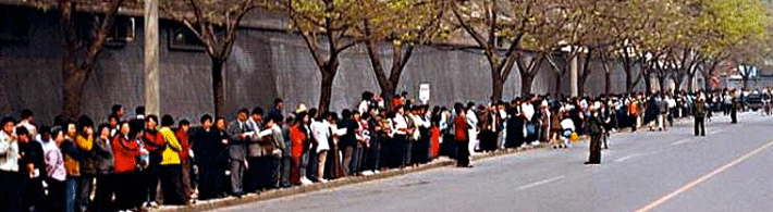 ความเป็นมา : เมื่อวันที่ 23 และ 24 เมษายน ค.ศ. 1999 (พ.ศ. 2542) เจ้าหน้าที่ตำรวจในเมืองเทียนจินซึ่งอยู่ใกล้กรุงปักกิ่งทำร้ายร่างกายและจับกุมผู้ฝึกฝ่าหลุนกงหลายสิบคน ซึ่งรวมตัวกันอยู่ด้านนอกของสำนักงานของนิตยสารแห่งหนึ่ง เพื่อหารือเกี่ยวกับความคลาดเคลื่อนของบทความโจมตีฝ่าหลุนกงซึ่งตีพิมพ์ออกมาเมื่อเร็ว ๆ นี้ เมื่อข่าวการจับกุมแพร่กระจายออกไปและมีผู้ฝึกฝ่าหลุนกงสอบถามเจ้าหน้าที่มากขึ้น ผู้ฝึกก็ได้คำตอบว่าพวกเขาต้องไปอุทธรณ์ที่กรุงปักกิ่ง ในวันถัดมา (25 เมษายน) ผู้ฝึกฝ่าหลุนกงประมาณ 10,000 คน ต่างไปรวมตัวกันโดยไม่ได้นัดหมายที่สำนักงานอุทธรณ์กลางในกรุงปักกิ่งตามคำแนะนำของเจ้าหน้าที่เมืองเทียนจิน การรวมตัวเป็นไปอย่างสงบและมีระเบียบเรียบร้อย ตัวแทนของฝ่าหลุนกงหลายคนถูกเรียกเข้าพบนายกรัฐมนตรีจีน จู หรงจี และสมาชิกคณะทำงานของเขา เย็นวันนั้นข้อกังวลของผู้ฝึกฝ่าหลุนกงได้รับการจัดการเรียบร้อย ผู้ฝึกที่ถูกจับในเมืองเทียนจินได้รับการปล่อยตัวและทุกคนได้กลับบ้าน